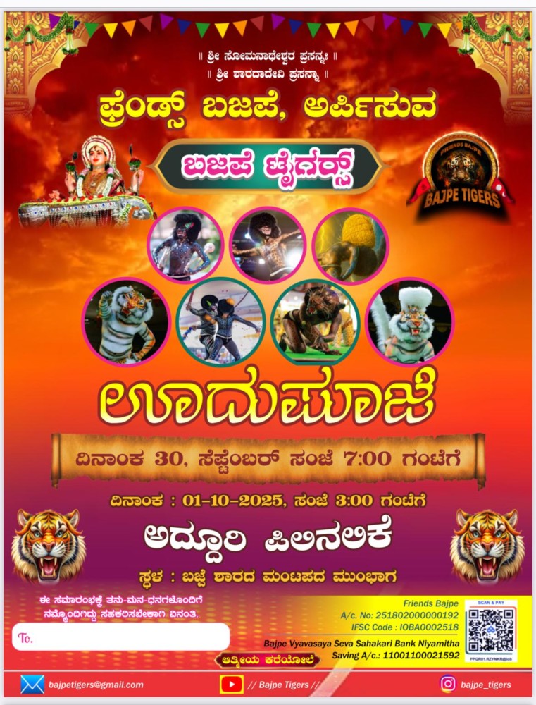 ಬಜಪೆ: ಫ್ರೆಂಡ್ಸ್ ಬಜಪೆ ವತಿಯಿಂದ, ಬಜಪೆ ಟೈಗರ್ಸ್ ನೇತೃತ್ವದಲ್ಲಿ 33ನೇ ವರ್ಷದ ಬಜಪೆ ಶಾರದೋತ್ಸವದ ಅಂಗವಾಗಿ, ಬಜಪೆ ಶಾರದಾ ಮಂಟಪದ ಮುಂಭಾಗದಲ್ಲಿ ಇದೇ ಅಕ್ಟೋಬರ್ 01, 2025 ರಂದು ಸಂಜೆ 3:00 ಗಂಟೆಗೆ ಪ್ರಥಮ ವರ್ಷದ 'ಅದ್ದೂರಿ ಪಿಲಿನಲಿಕೆ ' ವಿಜೃಂಭಣೆಯಿಂದ ನಡೆಯಲಿದೆ.