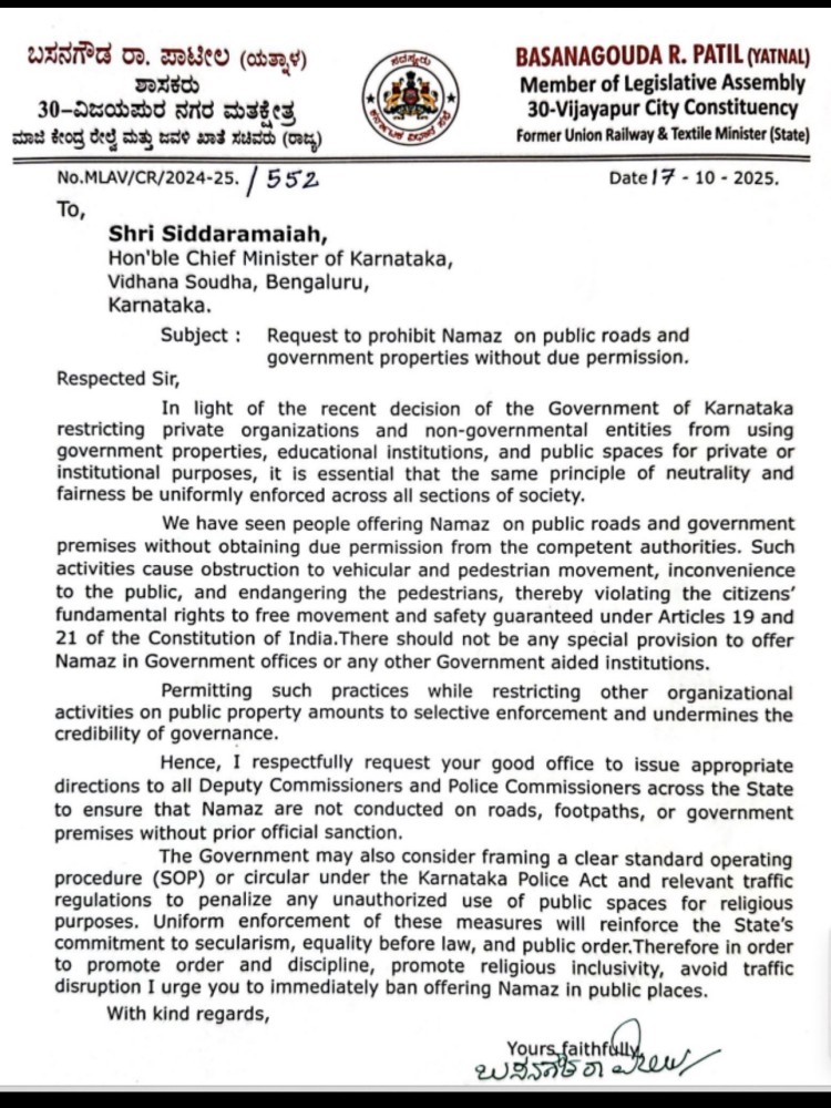 ಬೆಂಗಳೂರು : ಸರ್ಕಾರಿ ಸ್ಥಳಗಳಲ್ಲಿ ನಮಾಜ್ ನಿಷೇಧಿಸಿ ಎಂದು ಸಿಎಂ ಸಿದ್ದರಾಮಯ್ಯಗೆ ಬಸನಗೌಡ ಪಾಟೀಲ್ ಯತ್ನಾಳ್ ಪತ್ರ ಬರೆದಿದ್ದಾರೆ.