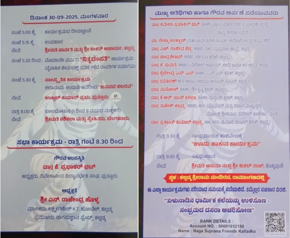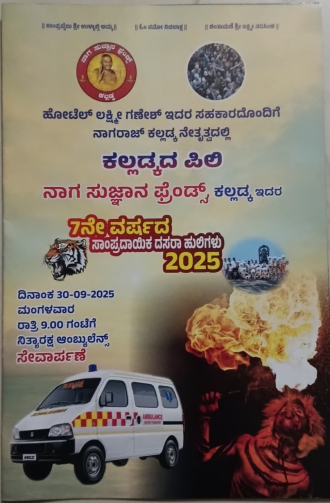ಕಲ್ಲಡ್ಕ: ಹೋಟೆಲ್ ಲಕ್ಷ್ಮೀ ಗಣೇಶ್ ಇದರ ಸಹಕಾರದೊಂದಿಗೆ ನಾಗರಾಜ್ ಕಲ್ಲಡ್ಕ ನೇತೃತ್ವದಲ್ಲಿ "ಕಲ್ಲಡ್ಕದ ಪಿಲಿ" ನಾಗ ಸುಜ್ಞಾನ ಫ್ರೆಂಡ್ಸ್, ಕಲ್ಲಡ್ಕ ಇದರ 7 ನೇ ವರ್ಷದ ಸಾಂಪ್ರದಾಯಿಕ 'ದಸರಾ ಹುಲಿಗಳು 2025' ದಿನಾಂಕ 30-09-2025 ನೇ ಮಂಗಳವಾರ ನಡೆಯಲಿದೆ.