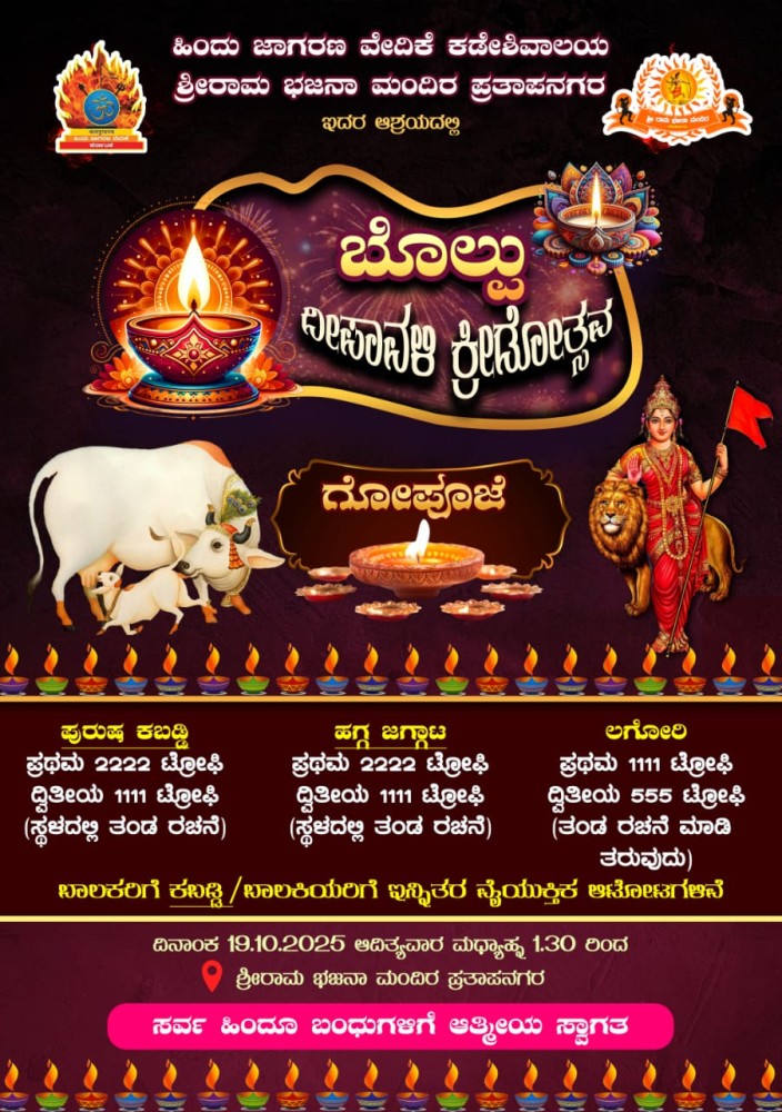 ಕಡೇಶಿವಾಲಯ: ಹಿಂದೂ ಜಾಗರಣ ವೇದಿಕೆ ಕಡೇಶಿವಾಲಯ ಮತ್ತು ಶ್ರೀರಾಮ ಭಜನಾ ಮಂದಿರ ಪ್ರತಾಪನಗರ ಇದರ ಆಶ್ರಯದಲ್ಲಿ 'ಬೊಲ್ಪು' ದೀಪಾವಳಿ ಕ್ರೀಡೋತ್ಸವ ಮತ್ತು 'ಗೋಪೂಜೆ' ಇದೇ ಬರುವ ದಿನಾಂಕ 19ನೇ ಆದಿತ್ಯವಾರ 2025 ರಂದು ಮಧ್ಯಾಹ್ನ 1:30 ರಿಂದ ಶ್ರೀ ರಾಮ ಭಜನಾ ಮಂದಿರ ಪ್ರತಾಪನಗರ ಇಲ್ಲಿ ನೆರವೇರಲಿದೆ.
