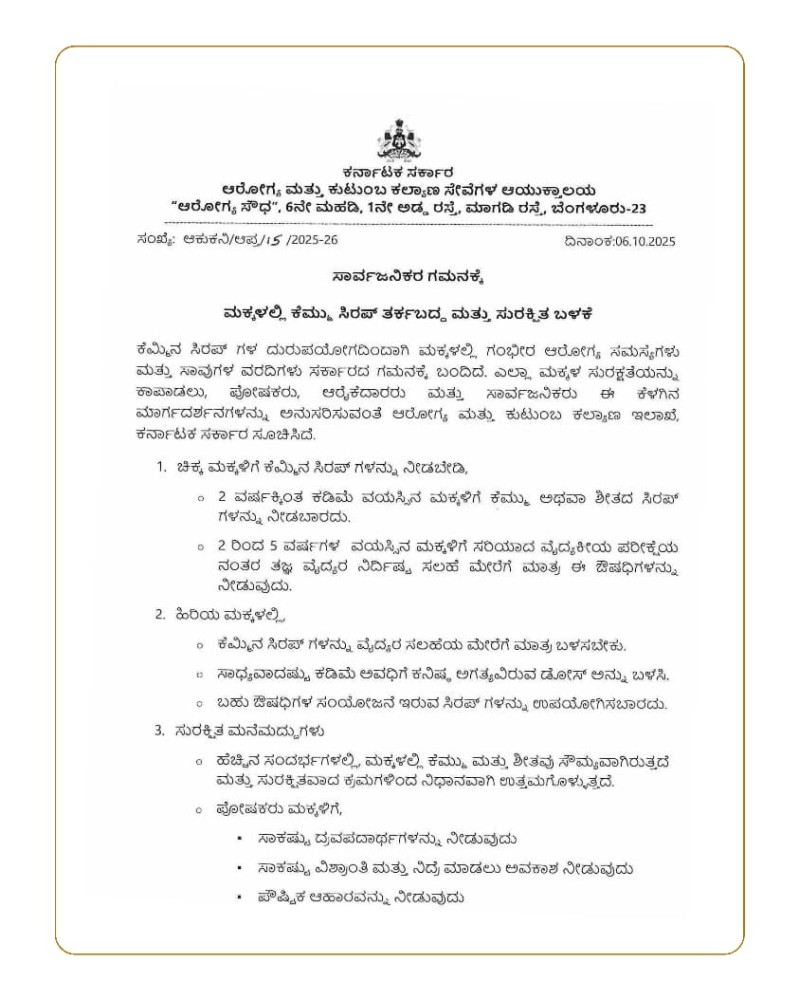 ಬೆಂಗಳೂರು: ಇತ್ತೀಚಿಗೆ ಮಕ್ಕಳಿಗೆ ಕೆಮ್ಮಿನ ಸಿರಪ್ ನೀಡಿದ ಪರಿಣಾಮ ಹೊರ ರಾಜ್ಯದಲ್ಲಿ ಹಲವಾರು ಮಕ್ಕಳ ಸಾವು ಸಂಬಂಧಿಸಿದ ಘಟನೆಯನ್ನು ಗಮನದಲ್ಲಿಟ್ಟುಕೊಂಡು ರಾಜ್ಯ ಸರಕಾರ ಸೂಚನೆಗಳನ್ನು ಬಿಡುಗಡೆ ಮಾಡಿದೆ.