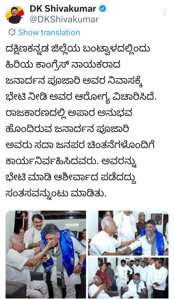 ಪೂಜಾರಿ ಅವರೊಂದಿಗೆ ಕೆಲಕಾಲ ಆತ್ಮೀಯ ಮಾತುಕತೆ ನಡೆಸಿದ ಡಿ.ಕೆ. ಶಿವಕುಮಾರ್, ಅವರ ಆಶೀರ್ವಾದ ಪಡೆದು ಸಂತಸ ವ್ಯಕ್ತಪಡಿಸಿದರು.