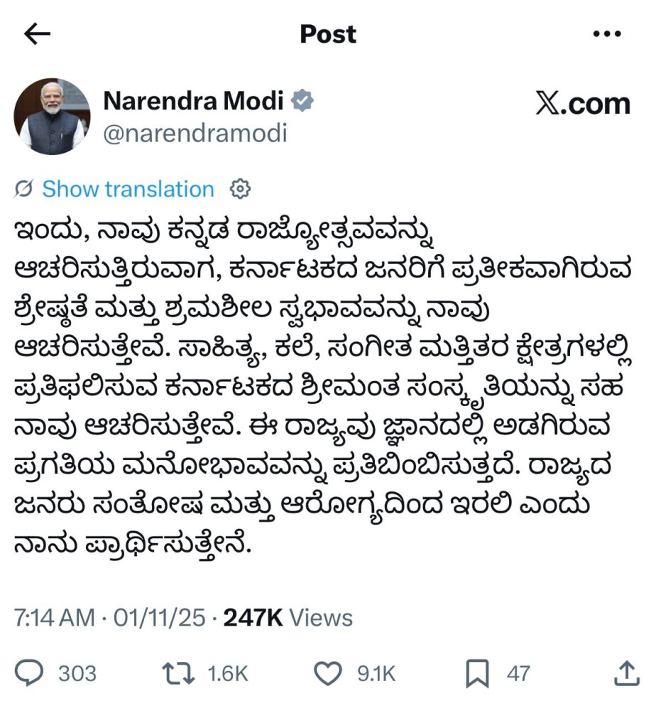 ಕನ್ನಡದಲ್ಲಿ ಟ್ವೀಟ್ ಮಾಡಿರುವ ಪ್ರಧಾನಿ ಮೋದಿ, 'ಇಂದು, ನಾವು ಕನ್ನಡ ರಾಜ್ಯೋತ್ಸವವನ್ನು ಆಚರಿಸುತ್ತಿರುವಾಗ, ಕರ್ನಾಟಕದ ಜನರಿಗೆ ಪ್ರತೀಕವಾಗಿರುವ ಶ್ರೇಷ್ಠತೆ ಮತ್ತು ಶ್ರಮಶೀಲ ಸ್ವಭಾವವನ್ನು ನಾವು ಆಚರಿಸುತ್ತೇವೆ. ಸಾಹಿತ್ಯ, ಕಲೆ, ಸಂಗೀತ ಮತ್ತಿತರ ಕ್ಷೇತ್ರಗಳಲ್ಲಿ ಪ್ರತಿಫಲಿಸುವ ಕರ್ನಾಟಕದ ಶ್ರೀಮಂತ ಸಂಸ್ಕೃತಿಯನ್ನು ಸಹ ನಾವು ಆಚರಿಸುತ್ತೇವೆ. ಈ ರಾಜ್ಯವು ಜ್ಞಾನದಲ್ಲಿ ಅಡಗಿರುವ ಪ್ರಗತಿಯ ಮನೋಭಾವವನ್ನು ಪ್ರತಿಬಿಂಬಿಸುತ್ತದೆ. ರಾಜ್ಯದ ಜನರು ಸಂತೋಷ ಮತ್ತು ಆರೋಗ್ಯದಿಂದ ಇರಲಿ ಎಂದು ನಾನು ಪ್ರಾರ್ಥಿಸುತ್ತೇನೆ' ಎಂದು ತಿಳಿಸಿದ್ದಾರೆ.