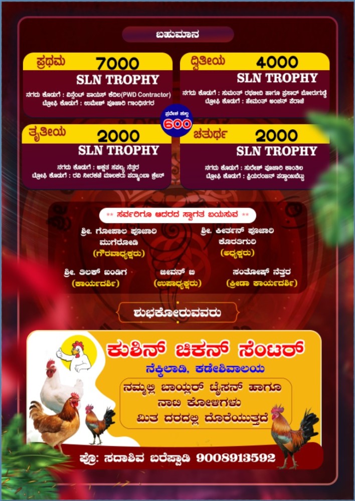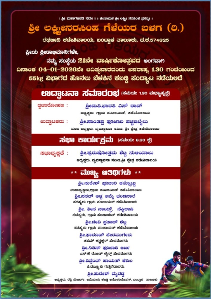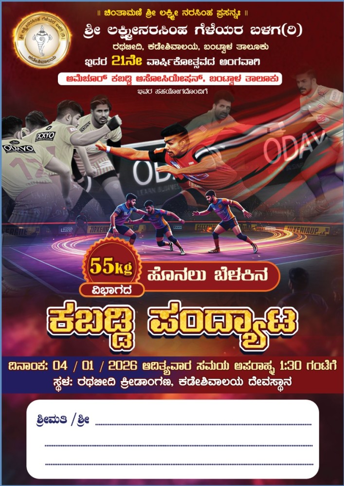 ಬಂಟ್ವಾಳ, ಕಡೇಶಿವಾಲಯ: 'ಶ್ರೀ ಲಕ್ಷ್ಮೀನರಸಿಂಹ ಗೆಳೆಯರ ಬಳಗ (ರಿ.) ರಥಬೀದಿ, ಕಡೇಶಿವಾಲಯ', ಬಂಟ್ವಾಳ ತಾಲೂಕು ಇದರ 21ನೇ ವಾರ್ಷಿಕೋತ್ಸವದ ಅಂಗವಾಗಿ 'ಅಮೆಚೂರ್ ಕಬ್ಬಡಿ ಅಸೋಸಿಯೇಷನ್', ಬಂಟ್ವಾಳ ತಾಲೂಕು ಇದರ ಸಹಯೋಗದೊಂದಿಗೆ '55ಕೆಜಿ ವಿಭಾಗದ ಹೊನಲು ಬೆಳಕಿನ ಕಬ್ಬಡಿ ಪಂದ್ಯಾಟ' ಇದೇ ಬರುವ ದಿನಾಂಕ 04, ರವಿವಾರ 2026 ರಂದು ಅಪರಾಹ್ನ 1:30 ಗಂಟೆಗೆ ರಥಬೀದಿ ಕ್ರೀಡಾಂಗಣ ಕಡೇಶಿವಾಲಯ ದೇವಸ್ಥಾನ ಇಲ್ಲಿ ಜರಗಲಿದೆ.